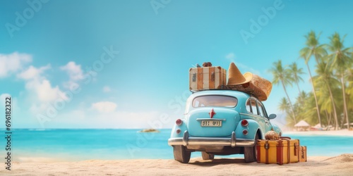 Fototapeta premium Car packed with luggage, all set for a summer holiday adventure on Golden sand meets the tranquil blue sea.