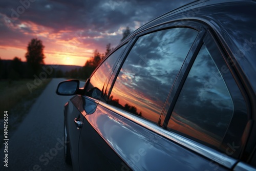 © ChaoticMind, Obraz premium Car parked on roadside reflecting vibrant sunset skies with dramatic clouds in twilight