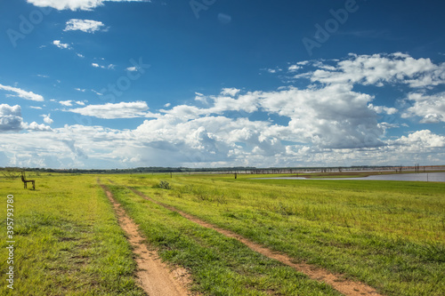 © Guga Asciutti, Obraz premium Car Path Through Green Grass Leading to a Reservoir with Blue Sky and White Clouds