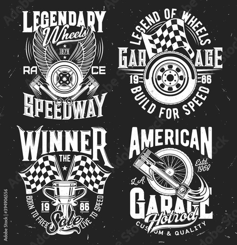 Obraz premium Car rally tshirt prints with vector checkered flag, vehicle wheel and parts,...