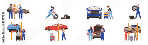 Obraz premium Car Repair Service with Mechanics Team in Garage Doing Technical Inspection and Automobile Diagnostics Vector Illustration Set