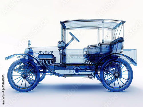 © Mister, Fototapeta premium Car 1900s visualization with augmented reality Transparent car in studio drawing in blue colors.