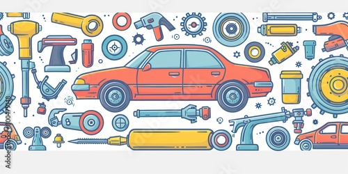 © Dekastro, Naklejka premium car service icons in simple outline doodle design scattered on a full background