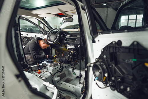 Obraz premium Car service worker installing noise insulation soundproofing in the car