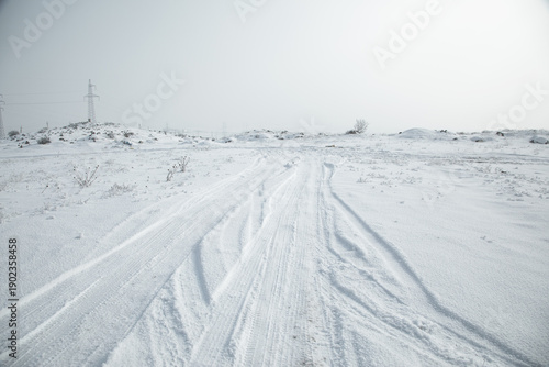 © andranik123, Fototapeta premium Car tire tracks in snow at winter.