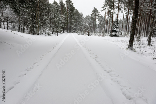 © Martins Vanags, Fototapeta premium car tire tracks on winter road