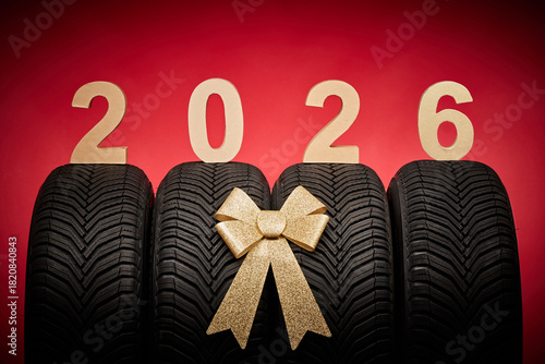 © ValentinValkov, Naklejka premium Car tires, new tyres, winter wheels isolated on christmas red background with text happy new year 2026