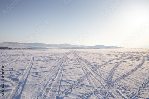 Naklejka premium Car track in fresh snow. Lake Baikal