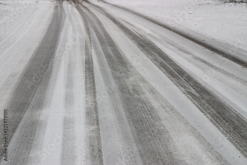 © EvgenyBelenkov, Naklejka premium car tracks on the road covered with fresh snow