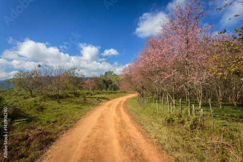 Naklejka premium Car tyre tracks, Wild Himalayan Cherry Blossom Flower with blue sky at Phu...
