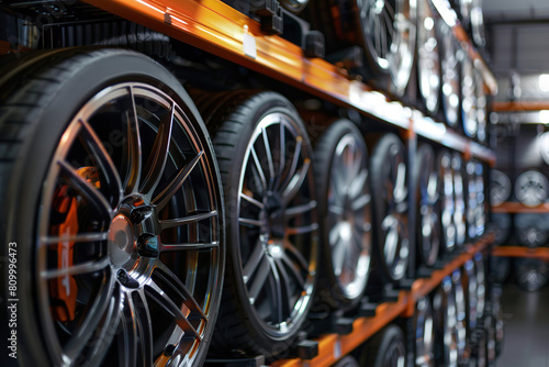 © Alina, Fototapeta premium Car wheels with new tires on blurred garage background