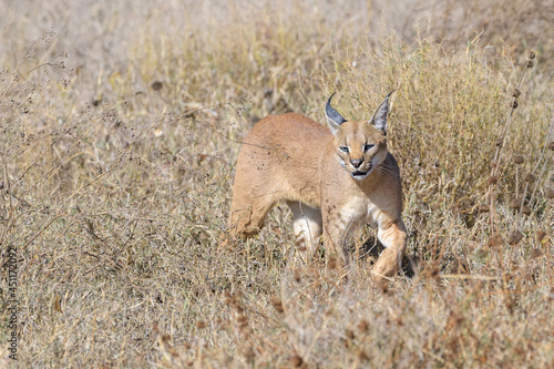© andreanita, Obraz premium Caracal (Caracal caracal) hunting on savanna, Ngorongoro conservation area, Tanzania.
