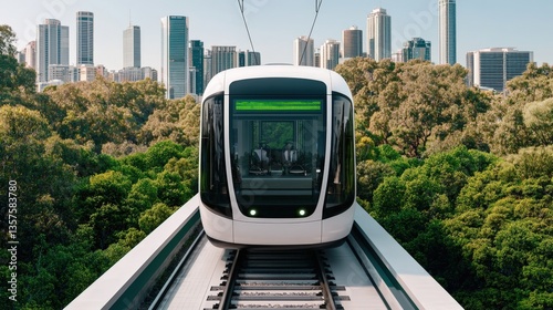 © Nitchalee N., Naklejka premium Carbon-neutral cities renewable and innovation, A modern tram glides along elevated tracks surrounded by lush greenery and a skyline of skyscrapers.