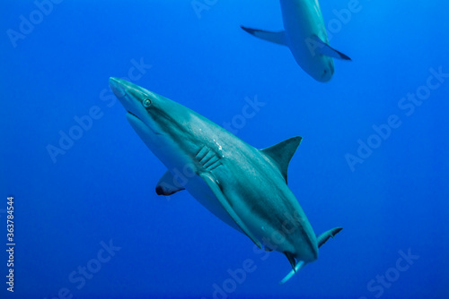Obraz premium 群青色に染まる海を悠々と泳ぐオグロメジロザメ(Carcharhinus...