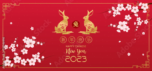 © Adisak, Fototapeta premium Card happy Chinese New Year 2023, Rabbit zodiac sign on red background. Elements with rabbit and sakura flower paper cut style. (Chinese Translation : happy new year 2023, year of the Rabbit) Vector.