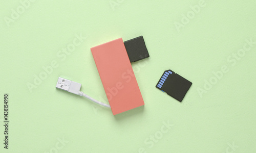 © splitov27, Fototapeta premium Card reader with two sd memory cards on a pastel green background