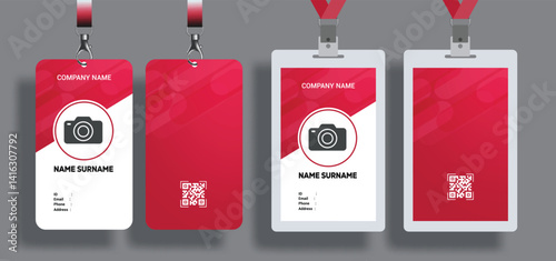 © AmazeinDesign, Naklejka premium Card red ID clipart template set. Company identification office badge clip art collection for employee personal data and identity information design vector illustration.