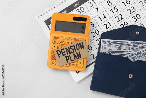 Obraz premium Card with phrase Pension Plan, dollar banknotes, calculator and calendar on white table, flat lay