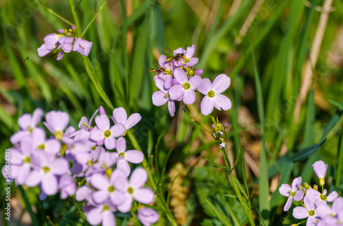 Fototapeta premium Cardamine pratensis, lady's smock flowering plant with bee on it