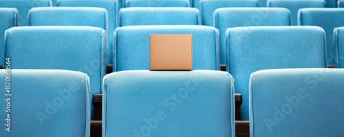 © donchanu, Obraz premium Cardboard Box on Empty Blue Seat in a Row of Chairs Audience Packaging Concept