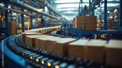 © amorn_m, Naklejka premium Cardboard Boxes on Conveyor Belt in Modern Warehouse