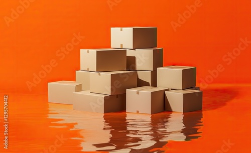 © Muhammad, Obraz premium Cardboard boxes stacked on orange water surface