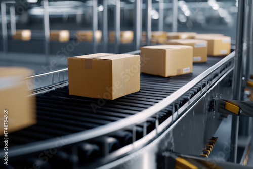 Naklejka premium Cardboard parcels moving along a dark conveyor belt in a modern logistics sorting facility, representing shipping and distribution