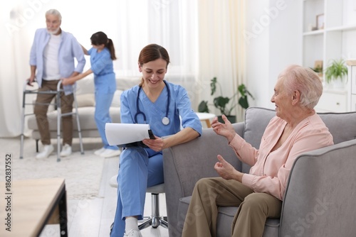Fototapeta premium Care worker asking senior woman about her wellbeing at retirement home