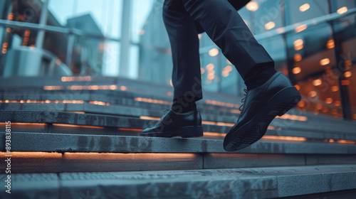 Fototapeta premium Career ladder. A man in a business suit is walking up the stairs. Ambition concept with businessman climbing stairs. Legs close-up, rear view. Career growth.