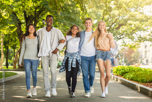 © Prostock-studio, Obraz premium Carefree multiracial students walking together by public park after university