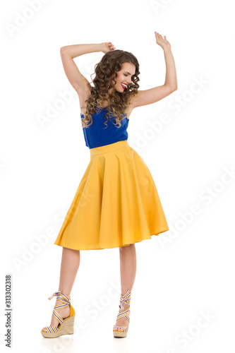 © studioloco, Naklejka premium Carefree Woman Is Dancing In Platform Shoes And Vibrant Clothes