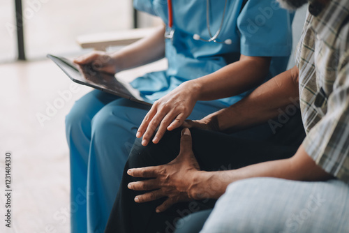 © ARMMY PICCA, Fototapeta premium Caregiver doctor or nurse training stretching leg and knee with patient senior man for physical therapy and rehabilitation, physiotherapist assistance elderly exercising, medical and insurance.