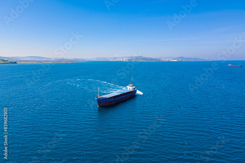 Fototapeta premium Cargo bulk vessel carrier cruising to entering port, aerial shot