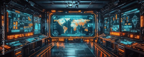 © PBMasterDesign, Obraz premium Cargo logistics tracking in world map and business network concept. Futuristic control room with monitors displaying world data.