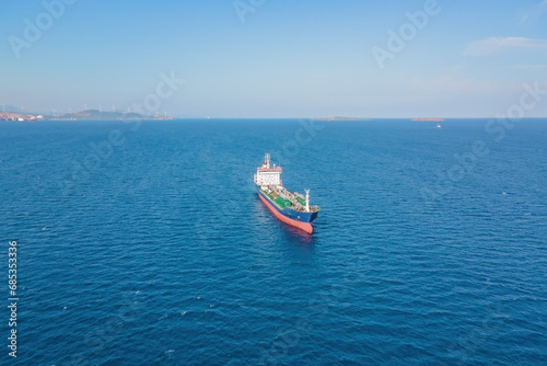 Naklejka premium Cargo Oil chemical tanker ship in anchorage near industrial port at sea, aerial shot