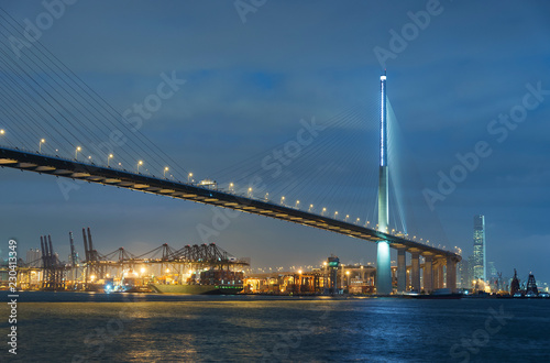 Naklejka premium Cargo port and bridge in Victoria Harbor of Hong Kong city at night