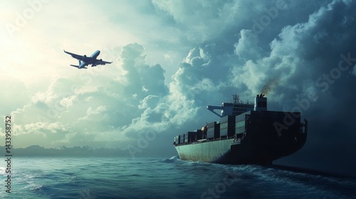 © Yothin, Fototapeta premium Cargo Ship and Airplane Over Dramatic Ocean