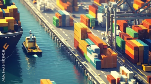 © Aysel, Fototapeta premium Cargo ship and truck at seaport waiting for container dock crane shipment harbour loading container boxes import and export commercial trade business logistic and transportation of international.