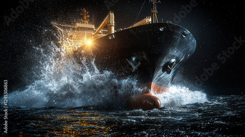 © Worakit, Obraz premium cargo ship bow cutting through waves at night, creating dramatic splashes and reflections