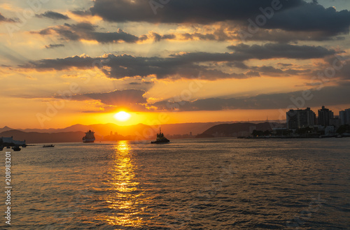 © Ranimiro, Obraz premium Cargo ship leaving the harbor, sailing out to sea with a beautiful sunset