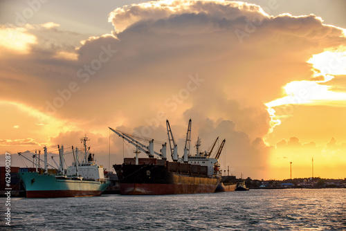 Fototapeta premium Cargo ship loading containers at sunshine