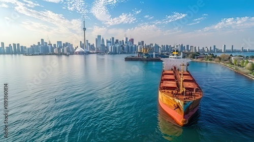 © Chandara, Naklejka premium Cargo ship moored at the harbor with a city skyline in the distance.