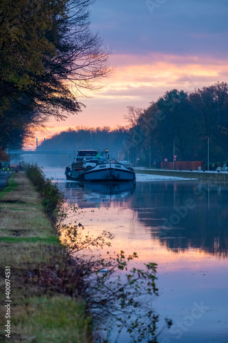 © Bjorn B, Fototapeta premium Cargo ship on a river during a misty sunrise morning. High quality photo
