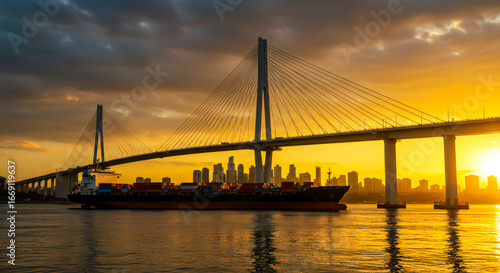 © dimas, Obraz premium Cargo Ship Passing Under Suspension Bridge