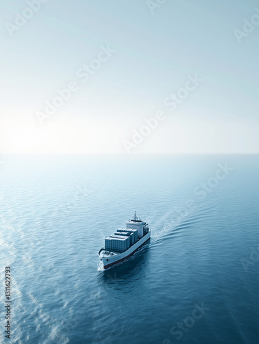 Naklejka premium Cargo ship sailing across a calm blue sea under a clear sky with sunlight reflecting on the water, symbolizing global trade