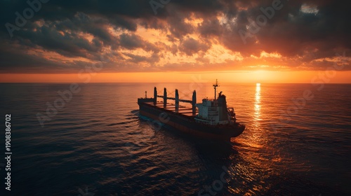 Fototapeta premium Cargo Ship Sailing on Calm Ocean During Dramatic Sunset.