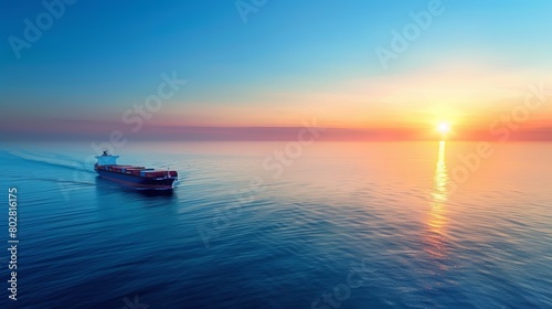 © Suleyman, Naklejka premium Cargo ship sails across the ocean at sunset against a clear blue sky. The vessel carries goods for international shipping and logistics, facilitating global trade and commerce.