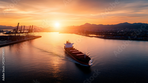 © Lailatul, Naklejka premium Cargo ship sunset port city harbor transport