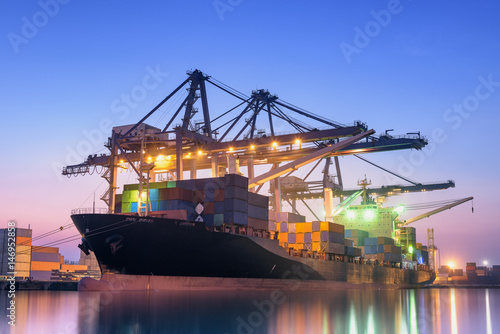 © Maha Heang 245789, Fototapeta premium Cargo ship unloading container at twilight.