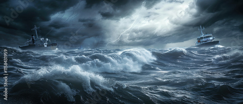 © KOSHKAROV SERGEI, Fototapeta premium Cargo Ships Braving Stormy Seas at Dusk